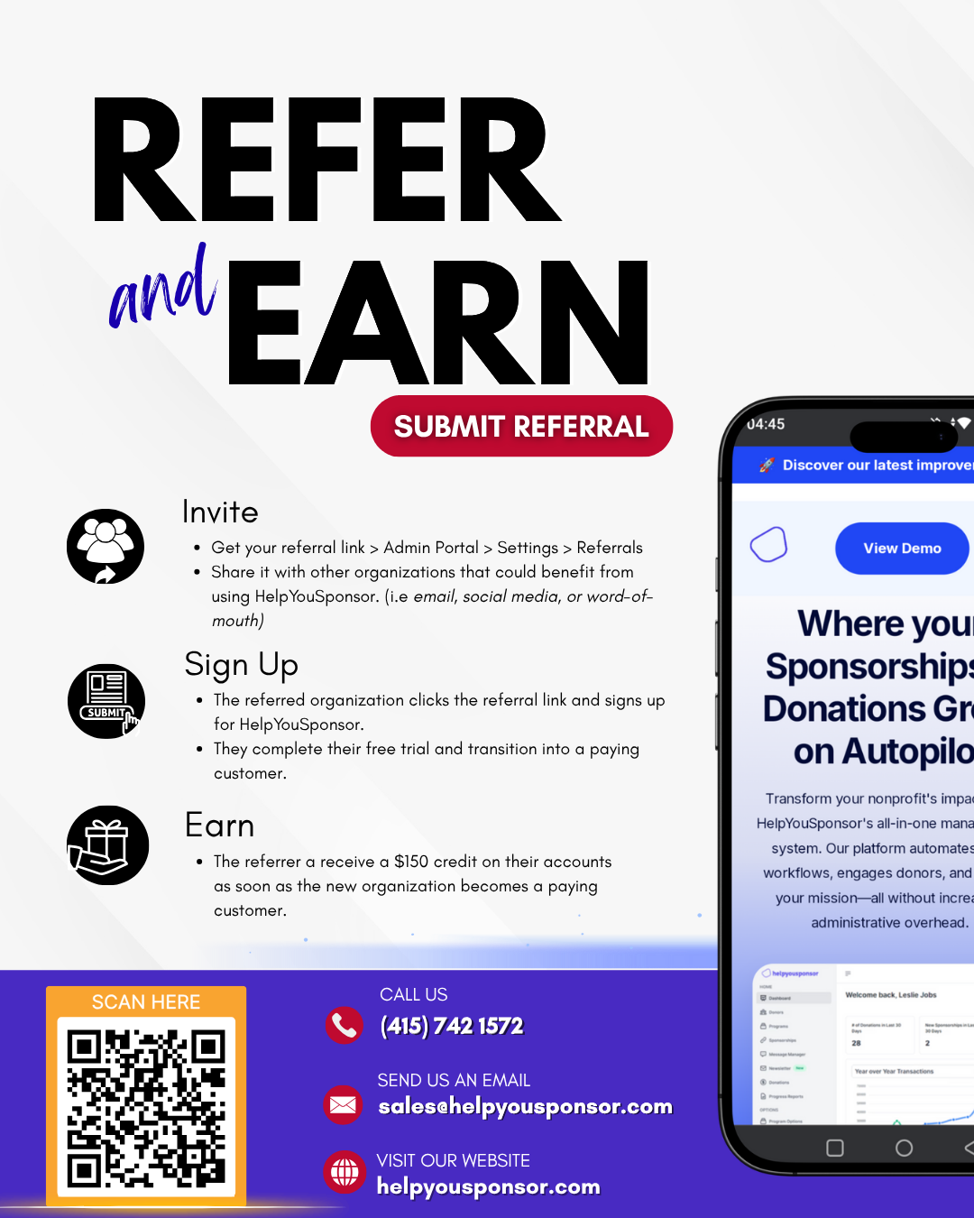 Know an organization that would benefit from HelpYouSponsor? Share your referral link and receive a $150 credit.