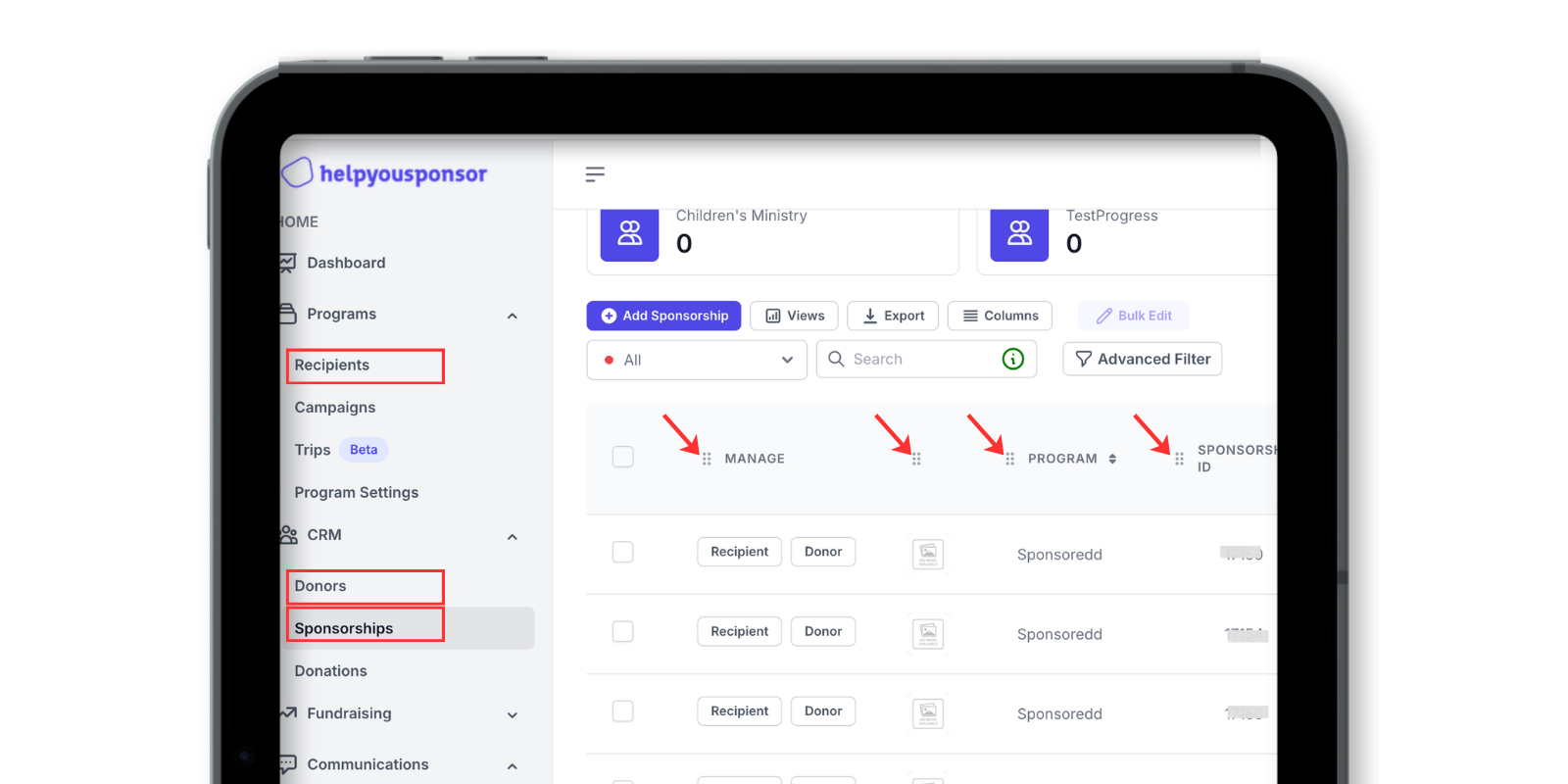 You can now click on any column to instantly sort your data and drag-and-drop columns into the exact order that fits your workflow. Whether you’re reviewing donors, managing recipients, or tracking sponsorships, you have full control over how your tables are organized. Learn More→